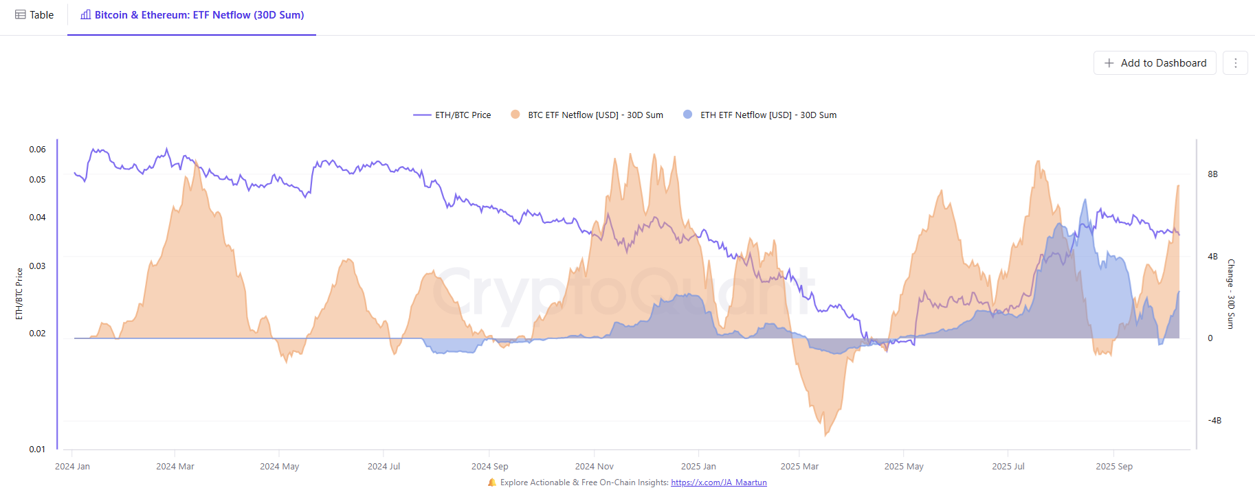ETF internet flows are a lot stronger for BTC, whereas ETH continues to be making an attempt to regain one in every of its latest peaks. In 2025, ETH skilled its first steady two-week interval with a lot stronger inflows in comparison with BTC, however the development has reversed.