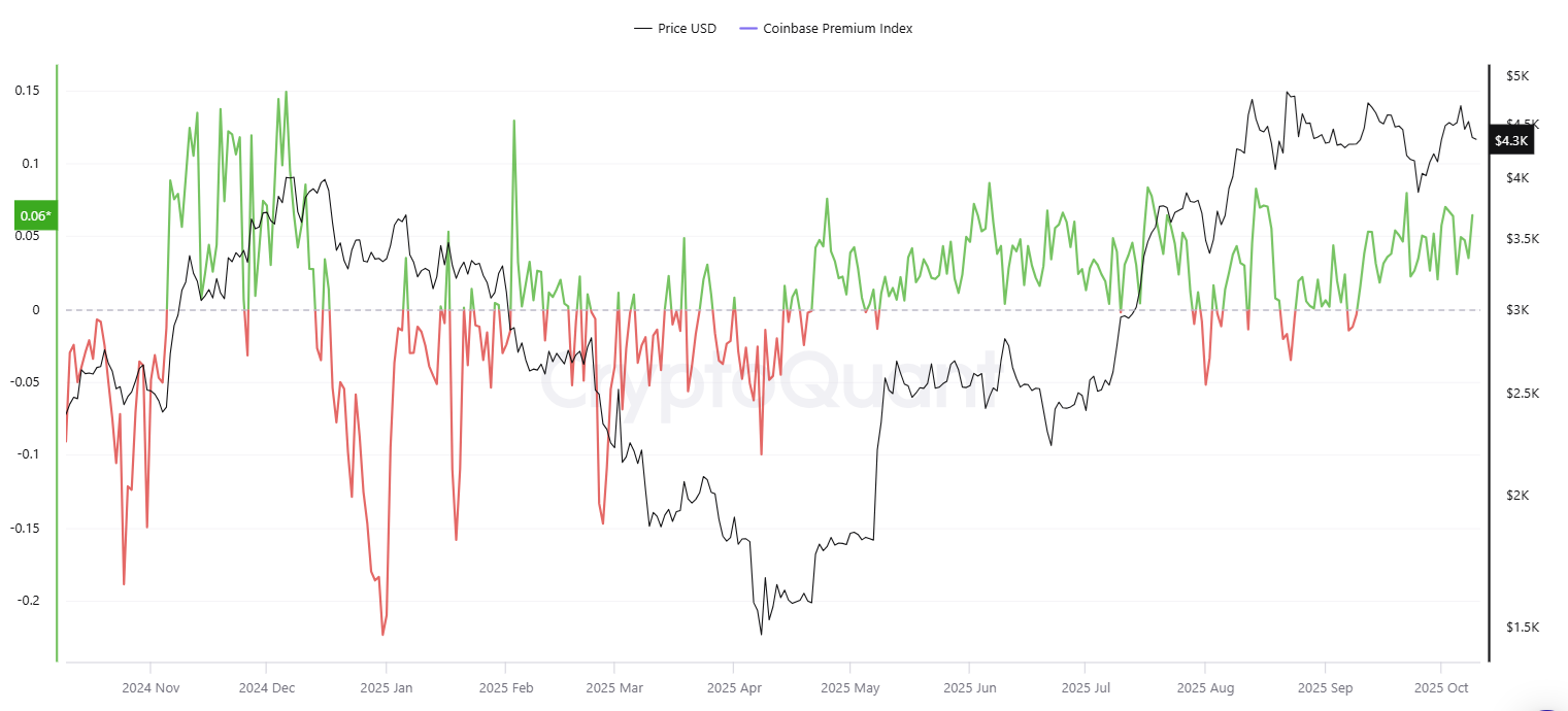 ETH is buying and selling at $4,357.20 and the Coinbase premium has remained constructive for the previous few weeks. Coinbase costs are a proxy for US investor sentiment and measure retailer habits, not sensible cash. Since Coinbase is measuring direct purchases because of the hype, ETH has a number of sources of influx together with ETFs and ETPs.